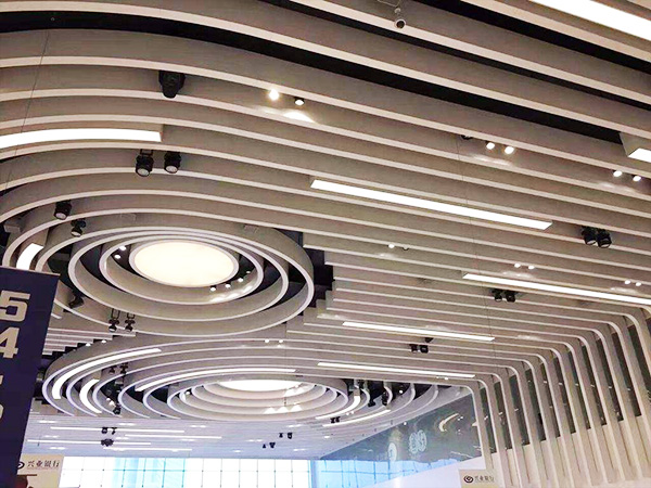 弧形鋁方通吊頂的設計,有基本的兩點要求,一個是底寬的要求,另一個是厚度的基本要求。兩者都是因為加工工藝的限制從而受到限制,波浪造型鋁方通吊頂的底寬,一般建議在30mm以上,小30mm,因為波浪造型鋁方通吊頂,是通過電焊固定成型的,電焊的過程中,需要保證整個鋁方通的平直度,如果底寬太小,電焊加工的過程中很容易造成歪曲,從而影響整根鋁方通的效果,其次,厚度的基本要求,是因為波浪造型鋁方通吊頂燒焊加工而成,燒焊的焊點比較多,溫度較高,如果是太薄的板子,一燒焊就穿了,這樣自然是加工不了的,因而波浪造型鋁方通吊頂厚度要求在2.0mm以上